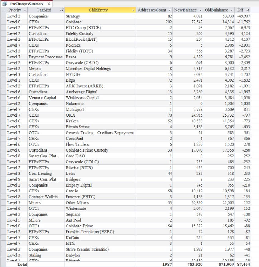 Sani’s “LiveChangesSummary” data showed Strategy’s 49,907 BTC outflow, Coinbase’s 11,762 BTC outflow, and ETC Group’s 6,973 BTC outflow as the largest movements, with smaller flows across custodians, exchanges, and miners.