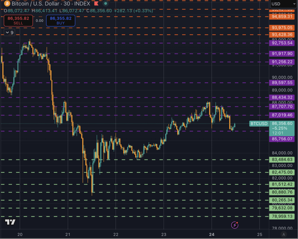 Bitcoin bounced off $85,000 over the weekend and stayed within the $87k to $89.6k decision zone. The move keeps price pinned between nearby liquidity shelves on the attached 30-minute map, with the first overhead cap clustered at $92.8k to $93.4k and